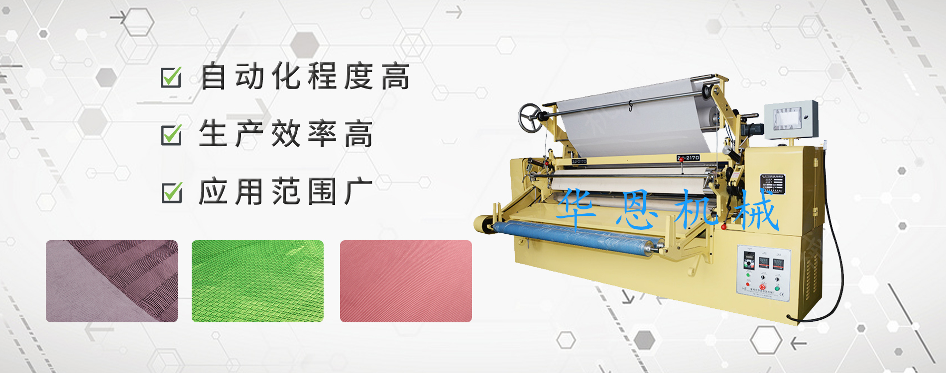 常州市華恩服裝機械廠生產(chǎn)的機器能摺出各種花色繁多、新穎別致的面料,加工定型后的面料立體感強、美觀大方。 使用本機能使各類服裝、時裝、裝飾布、床上用品、窗簾等產(chǎn)品增加品種,式樣迅速翻新,以快的速度適應(yīng)市場的需求。